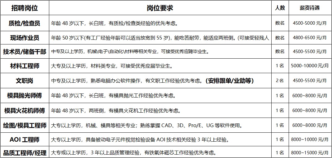福利待遇:五險(xiǎn)一金\各類補(bǔ)貼\培訓(xùn)\包食宿\體檢等。