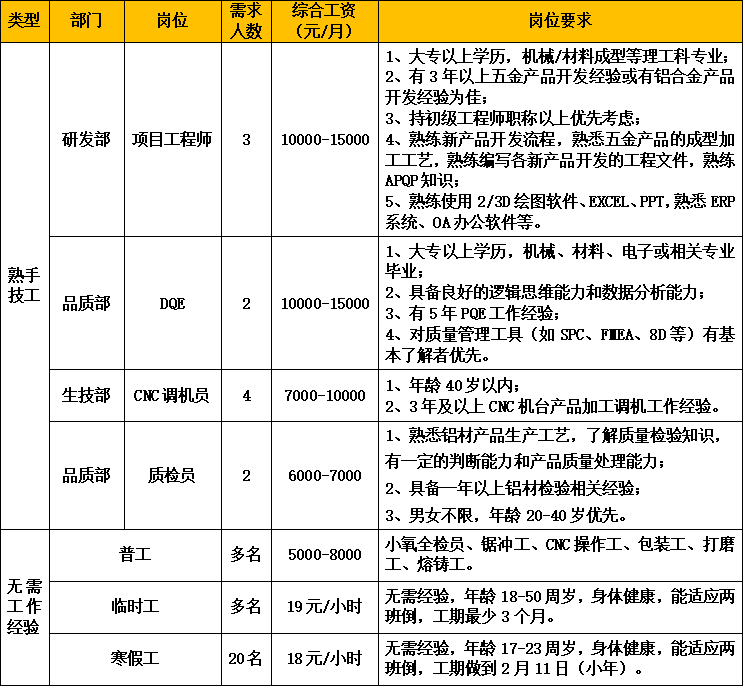 公司擁有廣東省唯一的鋁車體工程技術研究中心!扳伱冷X材”品牌先后獲得鋁型材行業(yè)內的最高榮譽:“中國馳名商標”、“中國著名品牌”、“中國名優(yōu)產品”;公司榮獲“國家高新技術企業(yè)”、廣東省“專精特新”企業(yè)等榮譽稱號。因生產發(fā)展需要,誠聘以下崗位: